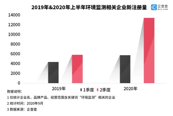 随着“十三五”环保规划的出台,及各项新的环保政策的指引下,环境监测行业得到稳步发展。企查查数据显示,今年上半年共新注册近2万家企业,同比上涨88%。特别是二季度,共新注册相关企业1.3万家,环比增长133%,同比增长130%。
