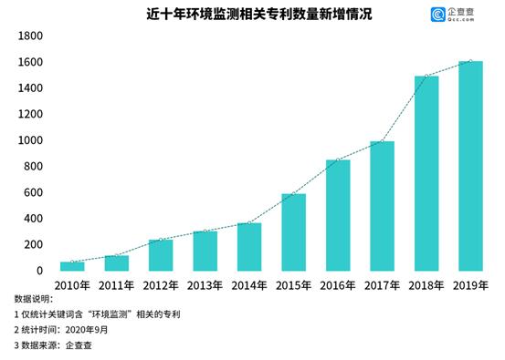 近十年来,环境监测相关专利申请量逐年稳定增长。企查查数据显示,环境监测相关专利共8千余件,2018年相关专利量破千,2019年达1600件,是2010年的22倍。