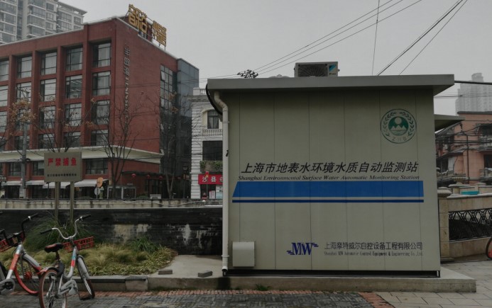 虹口港-哈尔滨路桥站,该站点地理位置:北纬n31°15′23.53″ 东经e121°29′3.72″。站房为可移动箱体式站房(岸边站)。取水点位距离河道北岸岸边1.5米,取水点位处水深约1.5米。监测断面上下游河道小幅度蜿蜒,监测断面河面宽约15米,河堤为石砌混凝土结构,比较平整、坚固。